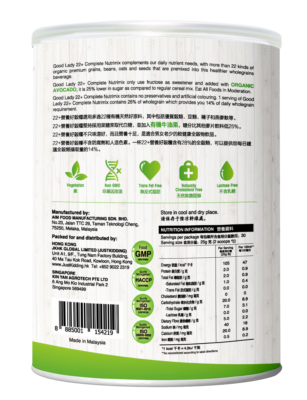 新加坡 福華補品 好姑娘 《22+營養好谷糧》有機牛油果(低糖)🥑 GoodLady 《22+ Complete Nutrimix》Organic Avocado (Low Sugar) 750g 📦購買滿$400 ,包郵到順豐站/自助櫃 💚健康生活,輕鬆開始💚 JustKidding作為 新加坡 福華補品及食之藝的香港授權獨家代理,致力於為忙碌的現代人提供全天然、無添加、純素的健康產品。我們提倡"開開心心,輕鬆養生"的理念,讓您和家人享受美味的同時,也能輕鬆照顧身體健康。 💚產品介紹💚 🔹《有機牛油果 22+ 營養好谷糧》選用多過26種有機天然好原料,其中包括12種優質穀類,7種豆類,8種種子和4種特別成分(包括有機牛油果,水溶性纖維,燕麥麩和卵磷脂)等。 🔹《22+營養好谷糧》堅特不用精製糖(例如白糖、砂糖、冰糖等等),只用少量蔬菜和水果糖來調味,並加入有機牛油果,糖分比其他谷糧飲料低25% 🔹新加坡原裝進口:馬來西亞自設廠房生產 🔹多項國際認證:GMP、HACCP、ISO 9001、ISO 22000 🔹⭐️新加坡健康優選標識⭐️:認證低糖高纖冇膽固醇健康配方。 🔹《22+營養好谷糧》不只味道好,而且營養十足,是適合男女老少的健康飲品。 💚全方位健康功效💚 ✔ 均衡每日營養需求 ✔ 維持心臟健康,降低膽固醇 ✔ 豐富膳食纖維促進腸道健康 ✔ 葉黃素保護眼睛,抵禦藍光傷害 ✔ 改善記憶力,幫助體重管理 💚適合人群💚 😣飲食不規律,營養攝取不足者 😣有肥胖問題或不良飲食習慣者 😣腸胃功能失調需要調理者 😣日常只攝取精製穀物(如白飯、白麵包)者 💪🏻全年齡層皆適用的營養補充 💚純淨配方承諾💚 ✘ 不含防腐劑、人造色素 ✘ 無精製糖、反式脂肪 ✘ 非基因改造、無膽固醇 ✘ 不含乳糖、純素配方 💚簡單三步,美味享用💚 1. 加入150-200ml熱水 2. 放入兩匙(約25g)穀物粉 3. 攪拌均勻即可飲用 每罐750克,大約可以沖30杯,每杯約25克。 讓《22+營養好谷糧》成為您健康生活的好夥伴,一杯滿足全天營養需求,隨時隨地補充能量!💪🏻😊 ⭐️新加坡「健康優選標識」(Healthier Choice Symbol) ⭐️認證詳解 《22+營養好谷糧》榮獲新加坡政府衛生部轄下之「健康促進局」(Health Promotion Board)頒發的「健康優選標識」,這是新加坡最權威的食品健康認證之一。該標識代表產品經過嚴格審核,符合以下健康標準: ✅ **低糖配方** - 含糖量比同類產品低至少25% - 完全不含精製糖(白糖、砂糖、冰糖) - 僅使用微量天然果糖調味 ✅ **高纖維含量** - 每份提供足量膳食纖維 - 促進腸道蠕動,維持消化健康 - 幫助控制血糖水平 ✅ **營養均衡配方** - 含優質植物蛋白質 - 富含維生素和礦物質 - 提供人體必需營養素 ✅ 嚴格的成分把關 🔍 **成分透明安全** - 所有成分來源明確標示 - 禁止使用有害人工添加劑 - 符合新加坡食品衛生最高標準 ✅ 認證審核流程 📋 **多維度評估** 1. 營養成分實驗室檢測 2. 生產流程審查 3. 原料來源追溯 4. 定期抽檢覆核 為什麼這個認證重要? 🌟 由新加坡政府機構直接監管 🌟 評估標準每2年更新,與時俱進 🌟 新加坡消費者最信賴的健康指標 🌟 代表產品在亞太區的健康領先地位 選擇帶有「健康優選標識」的產品,就是為家人選擇經過國家級把關的健康保證。我們自豪能通過這項嚴格認證,讓您喝得安心又健康❣️ *小知識:新加坡「健康促進局」隸屬衛生部,其「健康優選標識」自1998年設立以來,已成為東南亞最具公信力的食品健康認證之一。* Good Lady 22+ Complete Nutrimix complements our daily nutrient needs, with more than 22 kinds of organic premium included 12 types of grains, 7 types of dehulled beans, 8 types of seeds and 4 types of special ingredients that are premixed into this healthier whole grains beverage. Good Lady 22+ Complete Nutrimix only uses Fructose as sweetener and added with ORGANIC AVOCADO, it is 25% lower in sugar as compared to regular cereal mix thus suitable for diabetic patients. KEY HIGHLIGHT重要特點: -NO PRESERVATIVES 不含防腐劑 -NO ARTIFICIAL COLOURING不含色素 -NON REFINED SUGAR ADDED不含精制糖 -NON GMO非基因改造 -TRANS FAT FREE無反式脂肪 -NATURALLY CHOLESTEROL FREE無膽固醇 -LACTOSE FREE 不含乳糖 -VEGAN全素 Tips提示: To determine a safe product to consumer ** Check out their certification! 消費者該如何確保產品的安全? **檢查產品的認證! Good Lady 22+ Complete Nutrimix is certified with the following: 好姑娘 22+營養好谷糧 已通過以下認證: -Healthier Choice Certified 較健康選擇認證 -Food MP Certified 食品 GMP 認證 -HACCP Certified (Quality Management) HACCP 認證(質量管理) -ISO 9001-2015 Certified (ISO 9001 - 2015 認證) -ISO 22000 - 2005 Certified (ISO 22000 - 2005認證) Steps衝泡步驟: 1) Add hot water (200ML) 加熱水 (200ML) 2) Add in two scoops (25G). 加入兩勺 (25G) 3) Stir and Serve. 攪拌均勻即可享用。 Storage儲存方法: Store in cool and dry place.請保存於陰涼乾燥處。 Product of Malaysia 馬來西亞產品 Weight: 750g