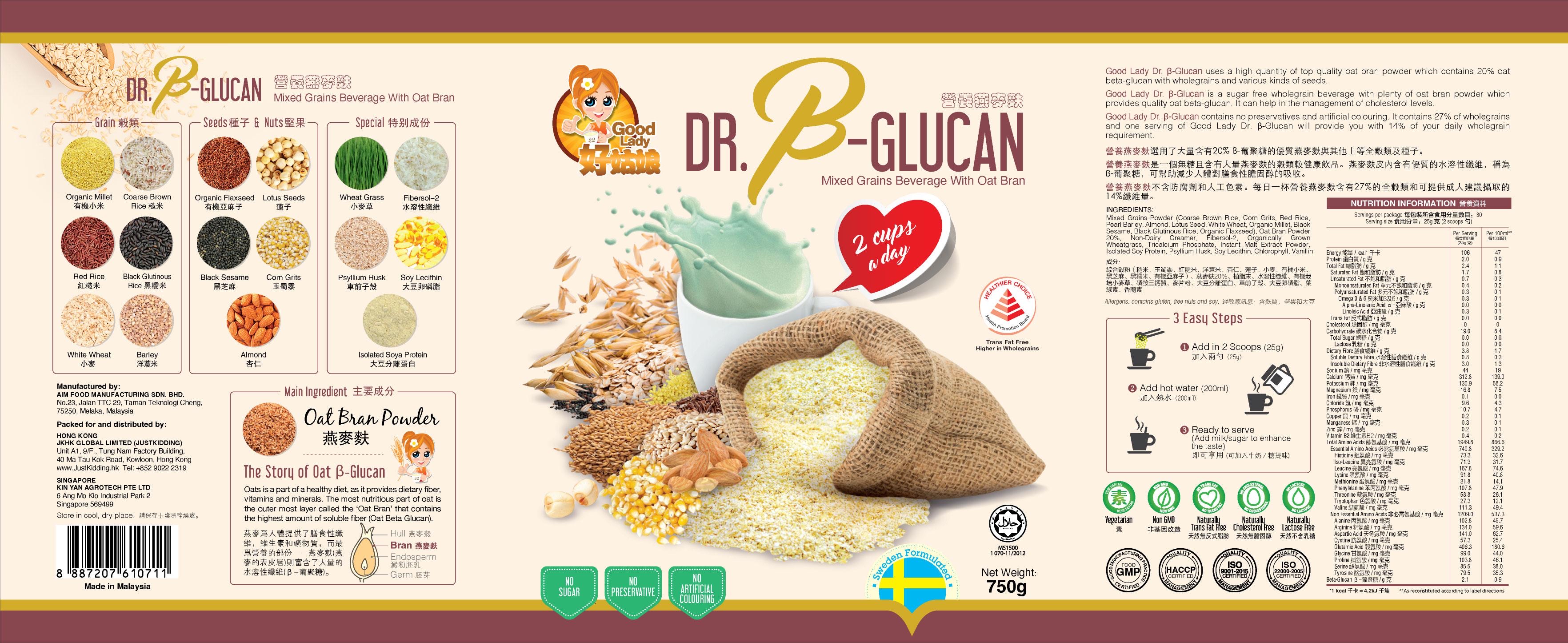 好姑娘 《營養燕麥麩 (無糖)》 - 750g Good Lady 《Dr. β-Glucan (No Added Sugar)》 - 750g 美味香濃,食在健康❣️ 新的加強配方富含更多身體所需營養素,將優質燕麥的優點與維生素及礦物質相結合出更營養的健康飲品! 無論您想要一頓豐盛的早餐還是健康的飲品,這種加強的燕麥麩都能為您提供美味、營養、健康的新體驗。試試看這強化新配方營養燕麥麩的美好,補充您一天所需的營養❣️ ✅純素 ✅非基因改造 ✅無反式脂肪 ✅無膽固醇 ✅不含乳糖 燕麥β-葡聚糖可改善。這些常見健康問題: 💚高膽固醇 💚糖尿病 💚肥胖問題 💚營養不均衡 燕麥是一種低糖、高營養、高能的全穀物。它不僅富含維生素B1,維生素 E、礦物質、蛋白質和鈣,而且富含膳食纖維。 燕麥的麩皮(燕麥麩)是燕麥高營養的精華所在。 燕麥麩中含有穀物最豐富的β-葡聚糖。 β-葡聚糖屬於一種可溶性膳食纖維,在體內不易被消化吸收,會帶來滿滿的飽腹感,並且能減緩血液中葡萄糖含量的快速增加,是非常優質的代餐。此外,燕麥中富含的膳食纖維不僅能潤腸通便,還可以有效預防和控制糖尿病及心血管疾病,降低膽固醇,對身體健康也非常有幫助。 您是否知道每日服用3克的β-葡聚糖(3大碗的燕麥)已被證明可以降低血液中的膽固醇? 根據馬來西亞衛生部(MOH)、歐洲食品安全局(EFSA)以及美國食品藥品監督管理局(US FDA)核准的健康聲明。 每天攝取至少3克的B-葡聚糖有助於維持健康的膽固醇與血壓,從而減低患上心血管疾病的風險。 Dr. β-Glucan是含有豐富高質量燕麥麩的無糖配方。 Dr. β-Glucan 燕麥β-葡聚糖含量比一般燕麥更高。 每日只需3勺的營養燕麥麩就能提供3.15克的燕麥B-葡聚糖。 成份: 1️⃣主要成份 - 燕麥麩 2️⃣穀類 - 有機小米、紅糙米、小麥、糙米、黑糯米、薏米 3️⃣種子與堅果 - 有機亞麻籽、黑芝麻、蓮子、玉蜀黍、杏仁 4️⃣特別成份 - 小麥草、纖維、松谷纖維、大豆卵磷脂、大豆分離蛋白 ✅全穀類來源 全穀類含有營養最豐富的麩皮層與胚芽,保留其膳食性纖維,維生素與礦物質等。 ✅Dr.B-Glucan是綜合了高品質的燕麥麩,多種全穀類與種子調配而成的健康全穀類飲品。提供了豐富的蛋白質,膳食纖維,天然的B-葡聚糖,18種氨基酸,11種維生素和礦物質,奧米加3&6和葉綠素等。 ✅ 小麥草(鹼性食品之王) 有“鹼性食品之王”之稱的小麥草提供了豐富的葉綠素,維生素,礦物質以及抗氧化成份,有助於細胞排毒與提高身體的免疫能力。 ✅天然 β-葡聚糖 Dr.B-Glucan選用了大量高品質的燕麥麩,提供了豐富的B-葡聚糖以維持健康的膽固醇及血糖,也能增加腸胃的蠕動,從而改善便秘的問題以維持消化系統的健康。 ✅ 適合高膽固醇人士 每天2杯的Dr.B -Glucan提供了3g的天然B-葡聚糖(相等於3碗燕麥片),助於維持健康的膽固醇與血壓,從而減低患上心血管疾病的風險。 重量: 750g 每罐750克,大約可以沖30杯,每杯約25克。 ✨✨✨✨✨✨✨✨✨✨✨✨✨✨ Good Lady 《Dr. β-Glucan (No Added Sugar)》 - 750g Delicious & Healthy❣️ Good Lady Dr. B-Glucan+ oat bran powder packed with essential nutrients, the enhanced formula combines the goodness of premium oats with a strategic blend of vitamins and minerals. Whether you're aiming for a hearty breakfast or a wholesome snack, this enhanced oat bran promises a deliciously nutritious experience that supports your overall health. Embrace the enhanced goodness and fuel your day with the nourishment it deserves! Good Lady Dr. β-Glucan+ uses a high quantity of top quality oat bran powder which contains 20% oat beta-glucan with wholegrains and various kinds of seeds. Good Lady Dr.β-Glucan+ is a wholegrain beverage with plenty of oat bran powder which provides quality oat beta-glucan. Oat beta-glucans have been shown to lower blood cholesterol. High blood cholesterol is a risk factor in the development of coronary heart disease. Good Lady Dr.β-Glucan+ contains no preservatives and artificial colouring. It contains 28.5% of wholegrains and one serving of Good Lady Dr.β-Glucan will provide you with 14% of your daily wholegrain requirement. ✅Vegan ✅Non GMO ✅Trans fat free ✅Cholesterol free ✅Lactose free Weight: 750g #HockhuaTonic #Oat #betaglucans #naturalhealthtips #wellness #福華補品 #燕麥麩 #葡聚糖 #降膽固醇 #心血管健康 #健康小貼士 #健康 #goodlady #好姑娘 #justkidding #justkiddinghk #justkiddinghongkong